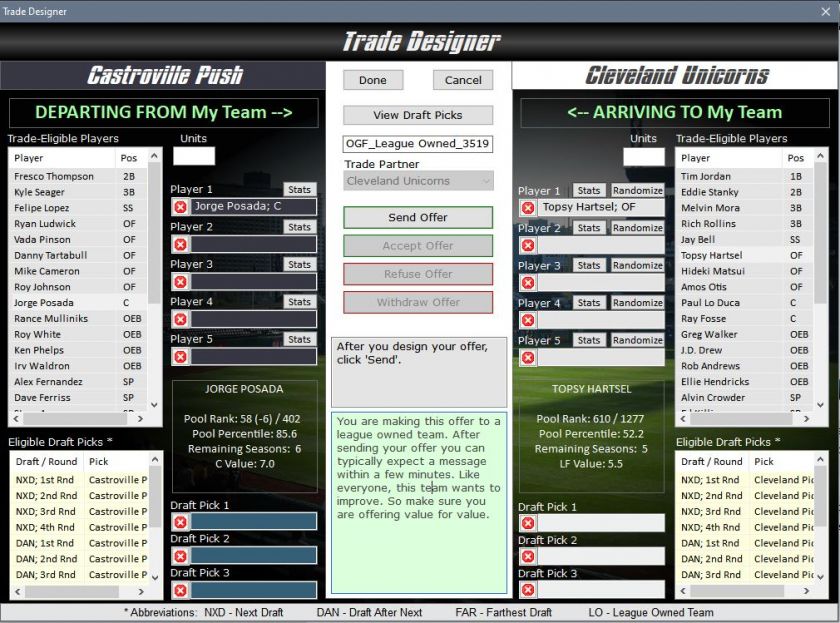 6. Any offer that is very "close" to acceptable has a small random chance of being accepted even if slightly undervalued. This is meant to encourage reasonable offers. Position for position trades (e.g., SP for SP or 2B for 2B) stand a slightly higher chance of success.