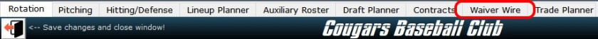 You can acquire players on waivers by clicking the Manage Button on the main toolbar, then selecting the Waiver Wire Tab as shown below.
