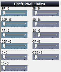 - These options help you fine tune your draft preparation. Use the sliders as shown below to set the maximum # of players you would want to draft from a given pool in any draft event. Say you have 8 SP (starting pitchers) on your "card" but want at most to pick up 2 of them. So, set the SP Slider Control to 2 to tell the sim to stop drafting SP if/when it reaches that limit.